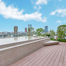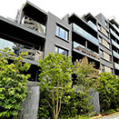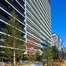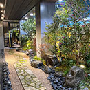 A courtyard with dynamic stonework and a "flow" is built on a compact site. Various ground cover plants are planted between the stones, and it is designed so that residents can enjoy detailed seasonal changes throughout the four seasons.
